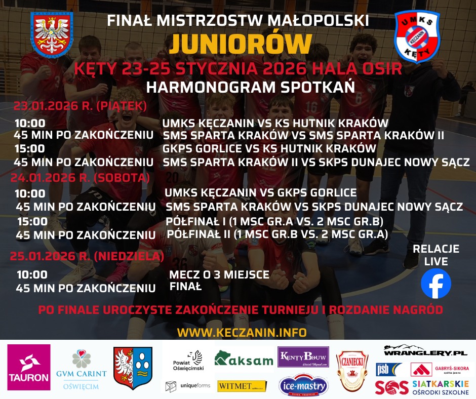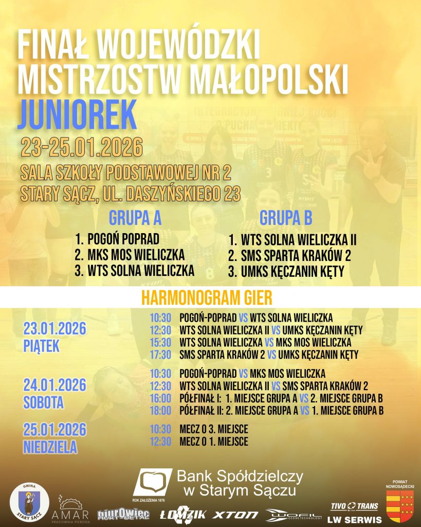Finał Mistrzostw Małopolski Juniorek odbędzie się w Starym Sączu, a gospodarzem Finału Mistrzostw Małopolski Juniorów będą Kęty.